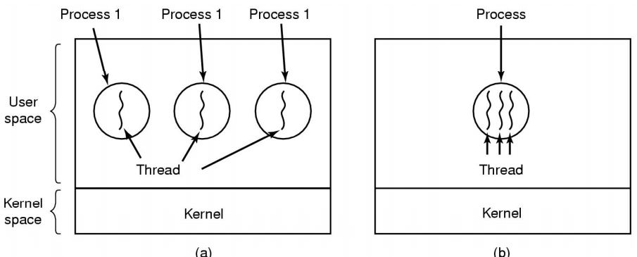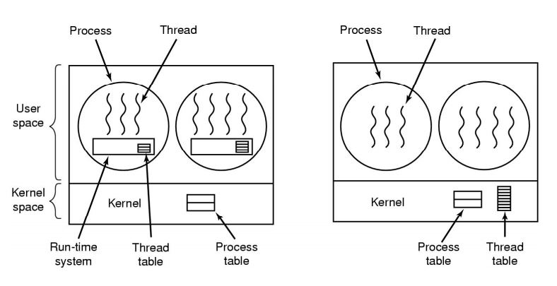스레드의 필요성이 생기면서 스레드의 개념이 없고 하나의 프로세스만 실행하던 유닉스 시스템에서 스레드를 구현하기 위해서는 상당한 양의 코드를 수정해야 할 필요성이 생겼다. 임시 방편으로 유저 레벨 스레드 패키지를 만들어 스레드를 지원했는데 기존과 동일하게 스케쥴러는 프로세스만 신경쓰지만 프로세스 내에 스케쥴링과 같은 운영체제 역할을 하는 작은 운영체제가 들어가 있는 것처럼 구현해서 이 작은 운영체제가 스레드를 스케쥴링 해주는것으로 스레드를 구현했다. 하지만 이 방식은 입출력을 요구하면 Blocked 상태가 존재하는 Blocking 시스템에서 입출력을 요구한 스레드만 Blocked 상태가 되는 것이 아니라 프로세스 전체가 Blocked 상태가 되는 문제점이 있었다. 물론 지금은 유저 레벨이 아닌 커널 레벨 스레드가 지원되기 때문에 상관없다. 커널 레벨 스레드는 운영체제가 스레드의 존재를 알고 스레드 단위로 스케쥴링을 한다.